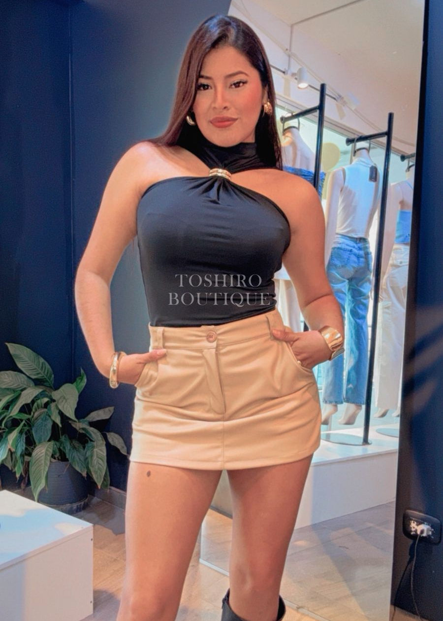 Blusa tipo halter manga cero con detalle de aro metálico en el centro del cuello.