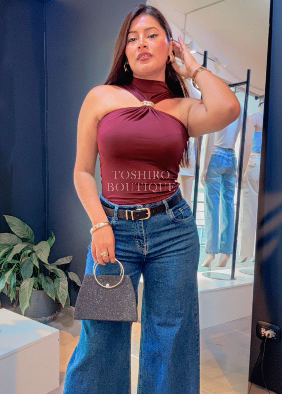 Blusa tipo halter manga cero con detalle de aro metálico en el centro del cuello.