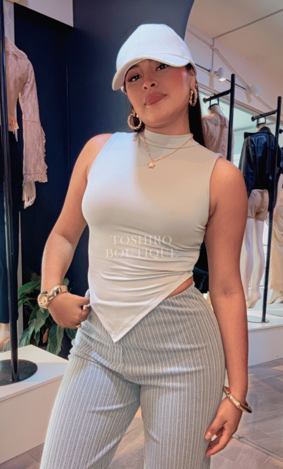 Blusa manga cero con cuello alto. Es hasta la cadera y el corte al final es en V.