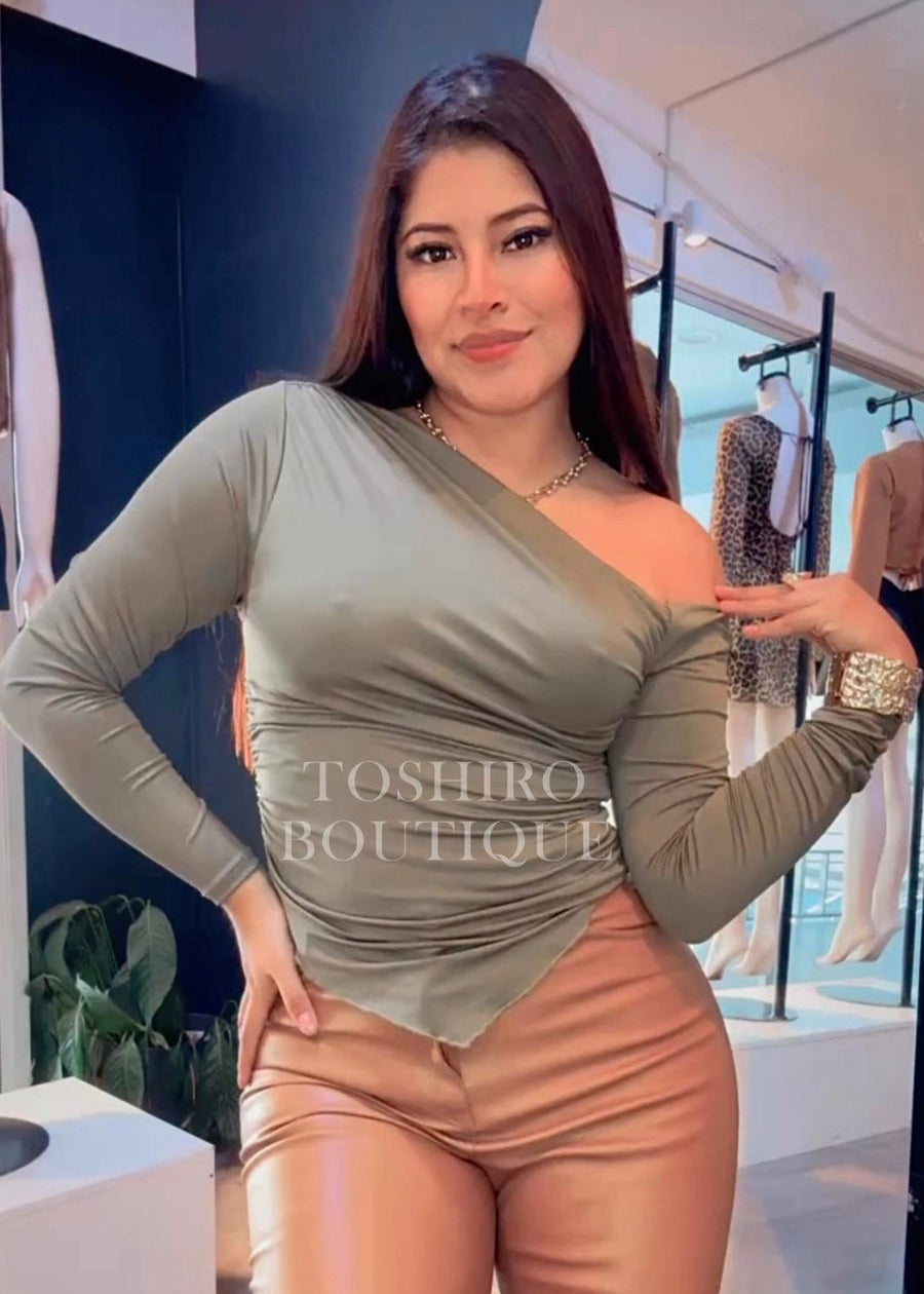 Blusa manga larga con cuello barco asimétrico y parte inferior drapeado con fruncidos laterales.