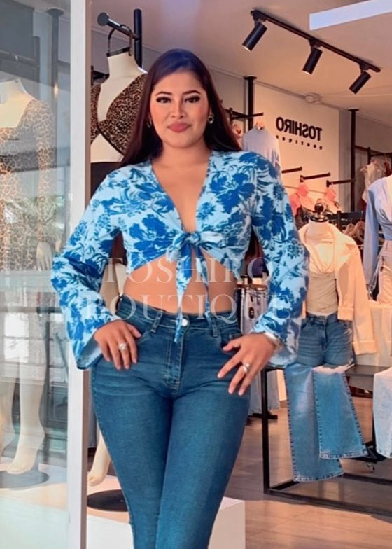 Blusa manda larga, con escote en V y se amarra en la parte de adelante. Cuenta con mangas acampanadas.