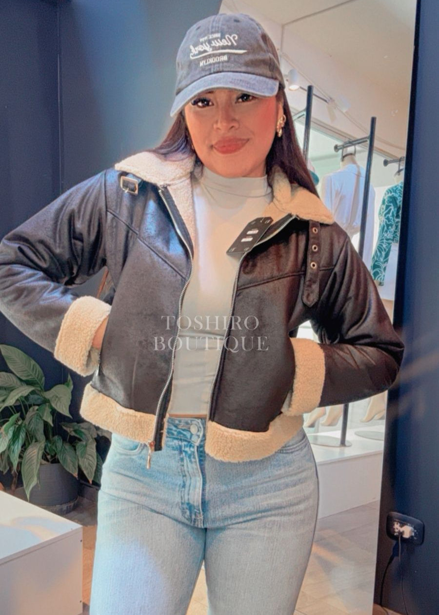 Casaca de cuerina tratada con forro y detalles de borrego en el cuello y puños, cierre de cremallera y bolsillos laterales