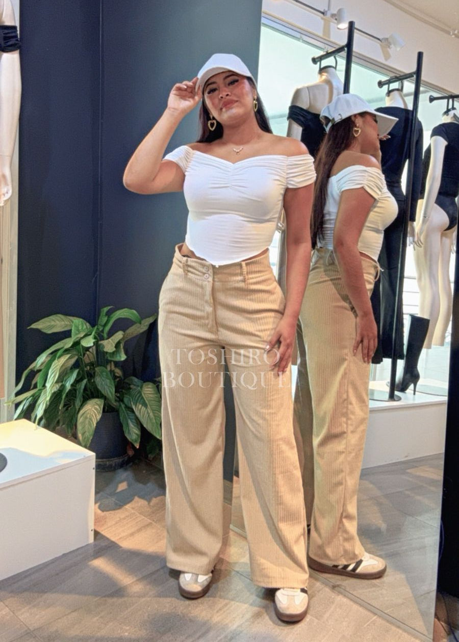 Pantalon de material corduroy, con un botón y cuenta con pinzas para realzar el derrier