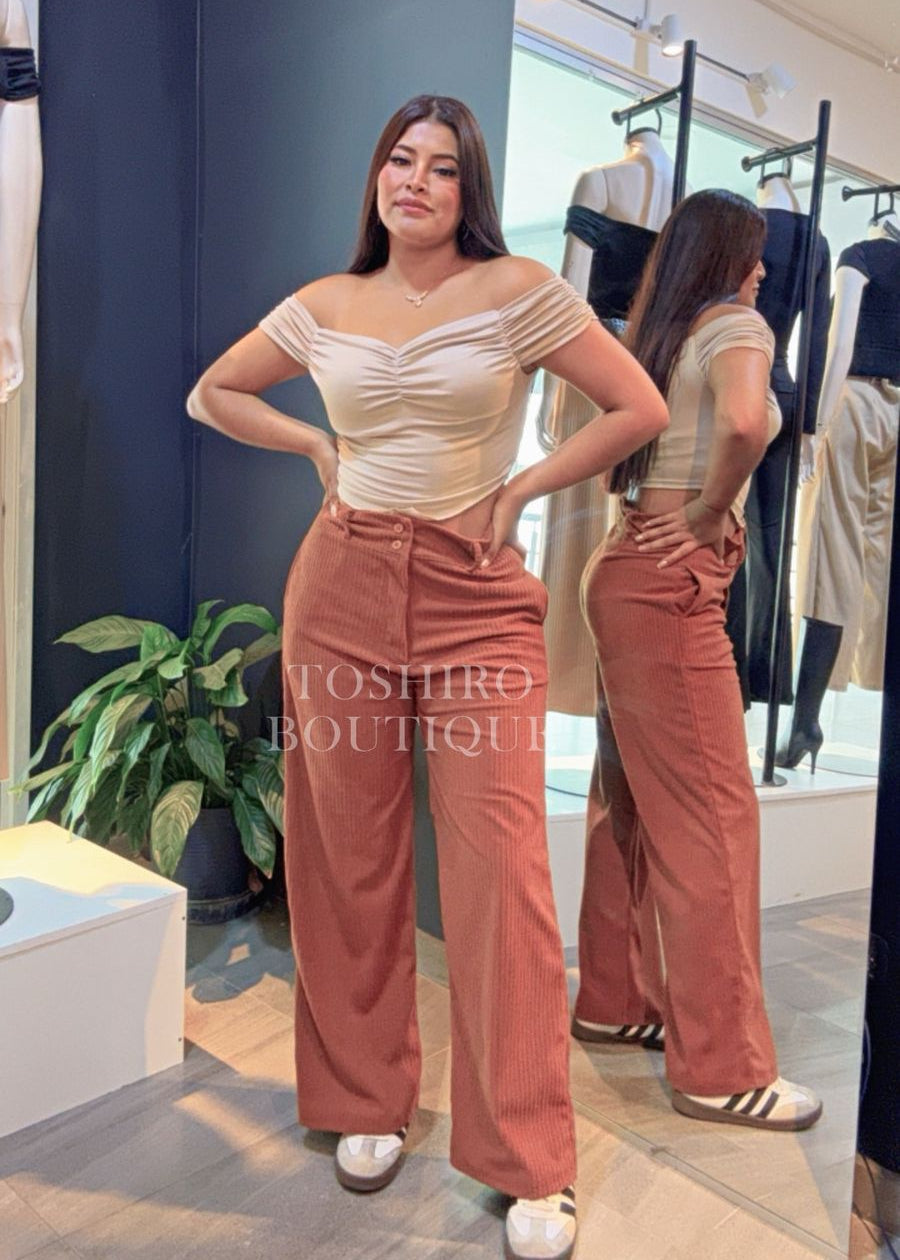 Pantalon de material corduroy, con un botón y cuenta con pinzas para realzar el derrier