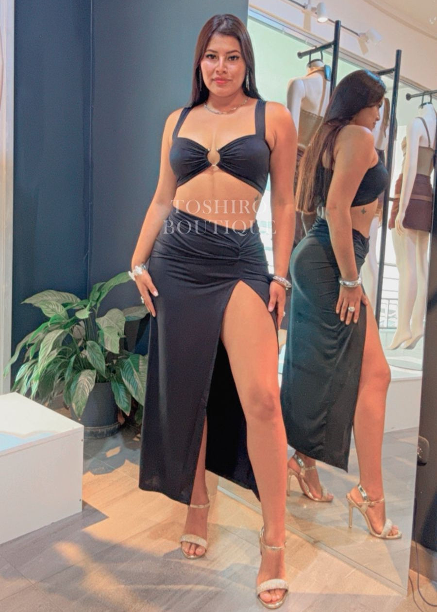 -La falda tiene una abertura desde la cadera hasta el largo del tobillo.