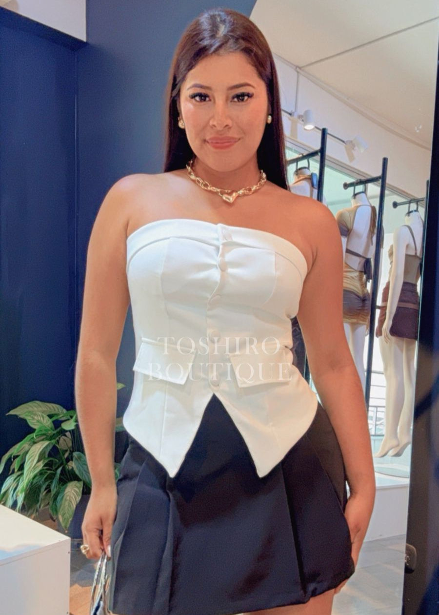 Blusa straple sastre con botones frontales, simulación de dos bolsillos delanteros y corte en pico