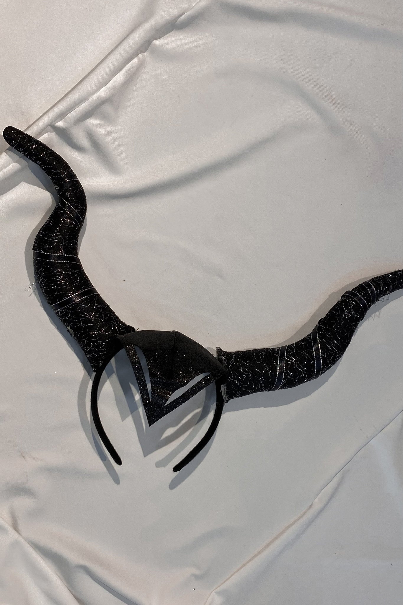 Vincha con dos cuernos de maléfica color negro y detalle de caída en la frente